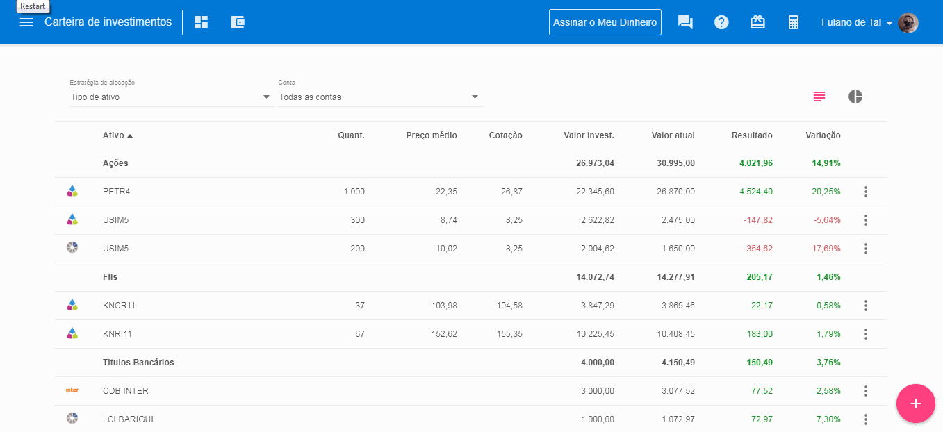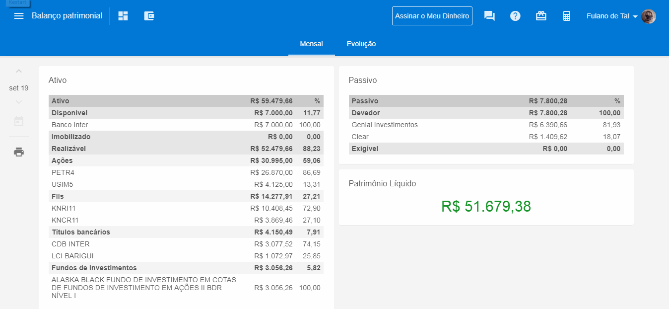 No Meu Dinheiro é possível controlar ativos reais, que dizem respeitos aos investimentos realizados na aquisição de algum bem físico e concreto como jóias, imóveis e veículos e os principais ativos financeiros negociados no mercado como: ações, opções, FII, ETF, fundos de investimento e previdência, títulos de capitalização, títulos bancários (CDB, RDB, LCA, LCI), tesouro diretor, moedas e cripto moedas, poupança e outros.