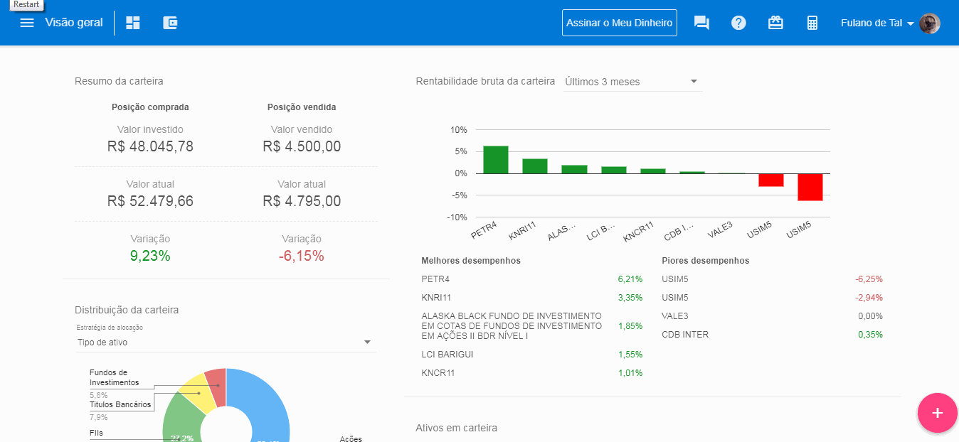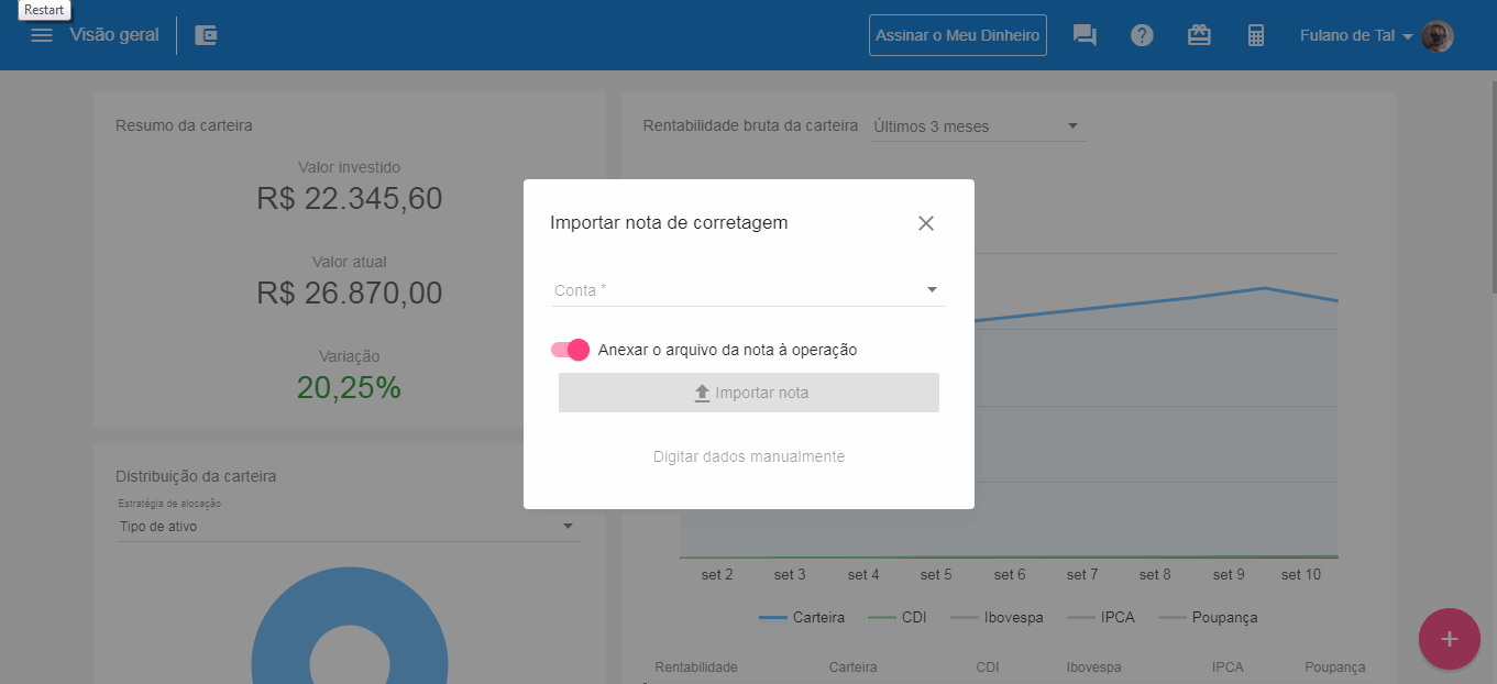 O Meu Dinheiro é uma plataforma para consolidar todos os seus investimentos de várias corretoras em um só lugar. Atualizamos automaticamente a rentabilidade, cotações, preços e os eventos corporativos de todas suas aplicações para você acompanhar tudo com facilidade e clareza.