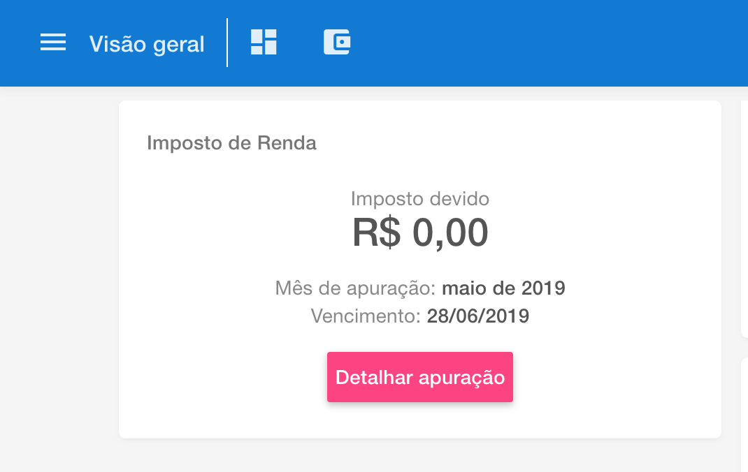 Para iniciar o processo de apuração de um determinado mês é necessário clicar no botão [Detalhar apuração], que é exibido no painel de Imposto de Renda da Visão Geral ou na tela de Imposto de renda que pode ser acessar pelo menu de principal, conforme imagens abaixo.