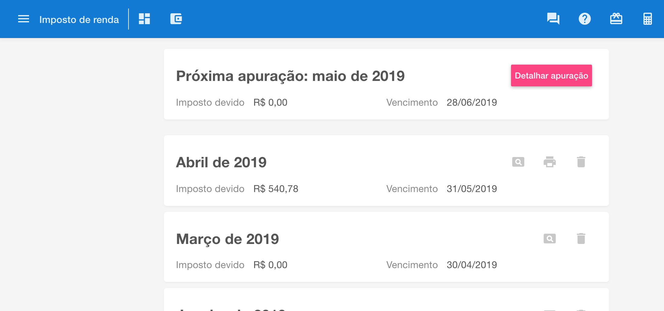 Na tela de imposto de renda é possível visualizar todas as apurações realizadas, bem como visualizar o detalhamento de cada apuração, excluir a apuração e reimprimir o DARF para pagamento do IR.