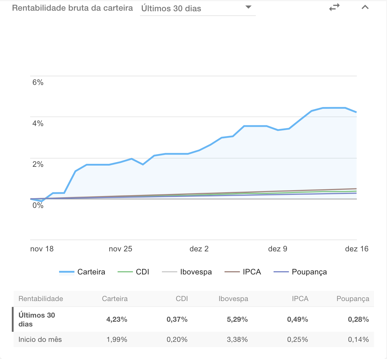 No Meu Dinheiro é possível realizar a comparação da rentabilidade histórica da carteira com vários índices de mercado como CDI, IBOVESPA, IPCA e Poupança.