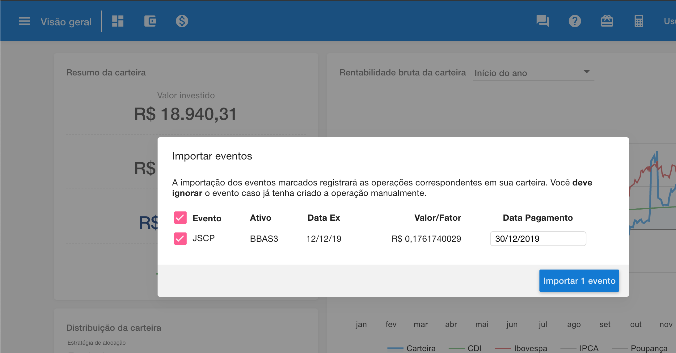 A aba Eventos corporativos na tela de detalhamento do ativo exibe todos os eventos de dividendos, JSCP, bonificações, proventos de FII, grupamentos e desdobramentos relacionados ao ativo no período em que o mesmo ficou vinculado à carteira do usuário, permitindo a importação dos mesmos, conforme imagem abaixo.