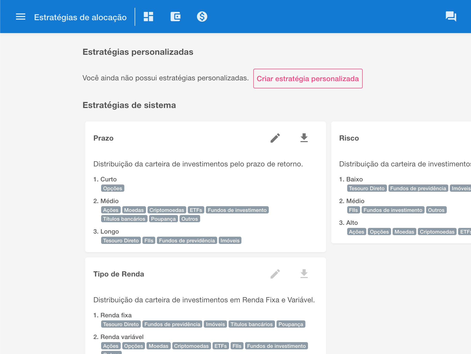 O recurso de estratégias de alocação permite configurar a alocação dos ativos dentro de estratégias padrões definidas pelo sistema, possibilitando avaliar e ajustar a carteira ao nível de risco e ao prazo de retorno ou liquidez mais adequado ao perfil do investidor.