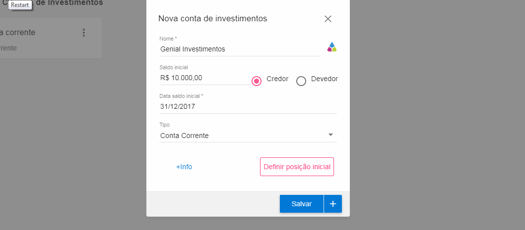 No momento do cadastramento da conta é possível definir a posição inicial dos ativos vinculados à mesma. Optando por definir a posição inicial não é necessário o registro de todo histórico de operações já realizadas.