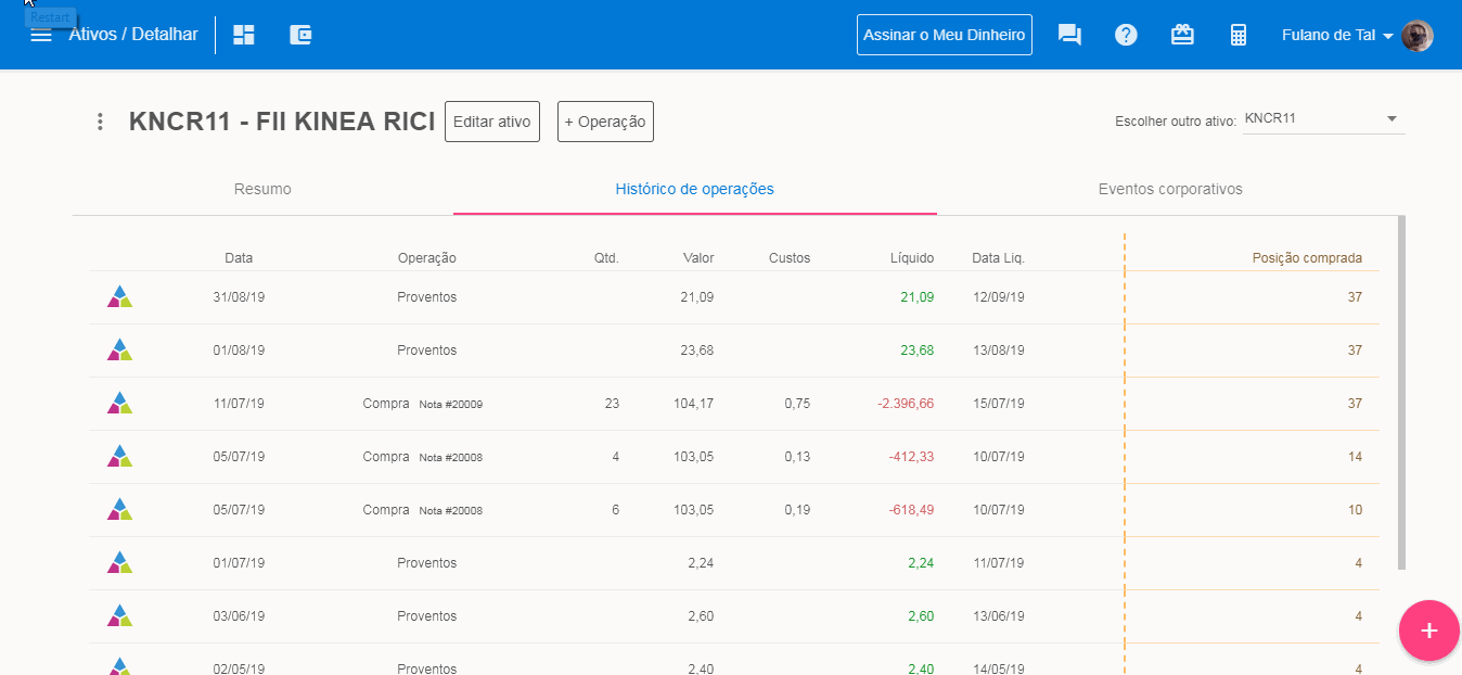 A edição ou exclusão de uma operação pode ser realizada na tela de histórico de operações ou detalhamento do ativo, conforme imagens abaixo: