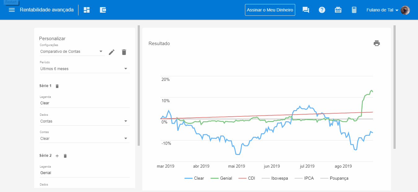 Na tela de rentabilidade avançada ainda é possível criar e salvar diversos cenários de comparação, por exemplo, entre dois ou mais ativos de sua carteira; entre sua carteira de ações com a carteira de renda fixa, etc
